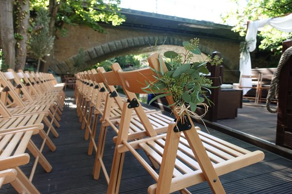 Dieser Holzklappstuhl eignet sich optimal für die Bestuhlung einer freien Trauung. Aber auch indoor versprüht der Stuhl seinen ganz eigenen Charme. Auf Anfrage sind auch Sitzkissen erhältlich.